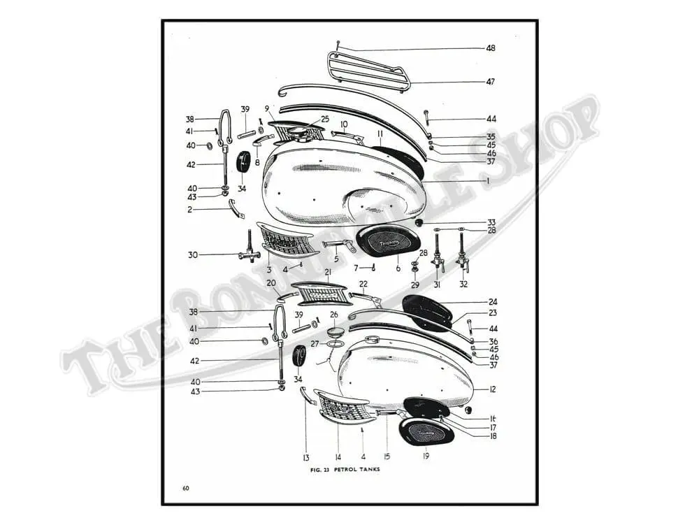 Full size 8.5″ x 11″ 1960-62 duplex frame 650 pre-unit Triumph parts book copy. Take the frustration out of parts ordering by buying one of these for your appropriate year model.