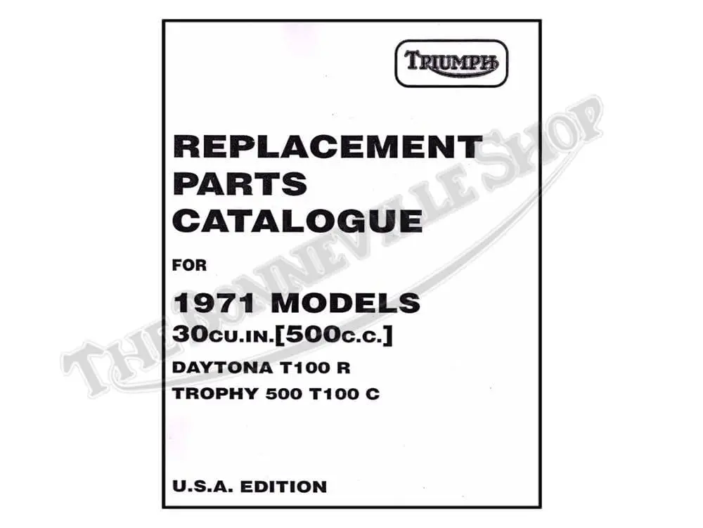 Full size 8.5″ x 11″ 1971 500cc Triumph parts book copy. Take the frustration out of parts ordering by buying one of these for your appropriate year model.