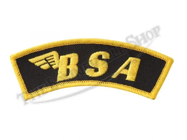 Dress up your club jacket, vest, hat or whatever else you desire with these UK made embroidered patches! Gold BSA logo & border on black background, approximate dimensions are 4-1/2″ x 1-1/2″.