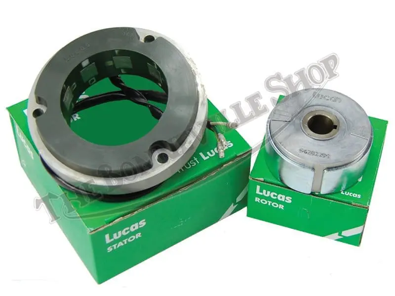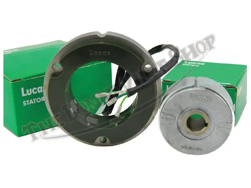 GENUINE LUCAS BRAND 3 PHASE ALTERNATOR STATOR AND ROTOR AS FITTED TO TRIUMPH TWINS 1979 ON. WHEN COUPLED WITH APPROPRIATE REGULATOR UNIT, THIS KIT CAN ALSO BE USED TO REPLACE THE SINGLE PHASE CHARGING SYSTEMS ON MOST TRIUMPH, BSA & NORTON SINGLES & TWINS OF THE 1960’S & 70’S.