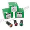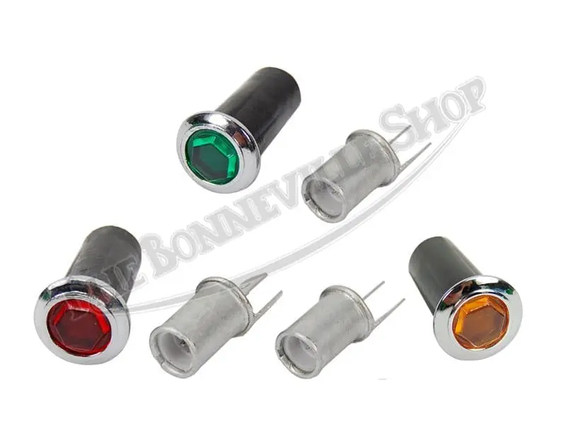 Genuine Lucas brand red / amber (yellow) / green warning light set with hexagonal facets as fitted to numerous British motorcycles of the 1960s and 1970s. Set includes one each of PN# 99-1207 54363453 LU54363453 amber (yellow), PN# 99-1208 54363454 LU54363454 red, and 99-1209 54363455 LU54363455 green lights. Bulb holders are also included.