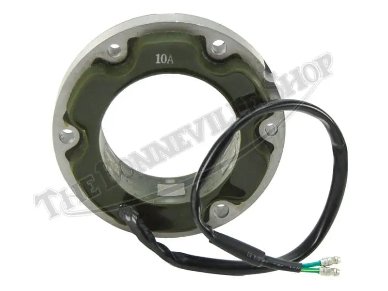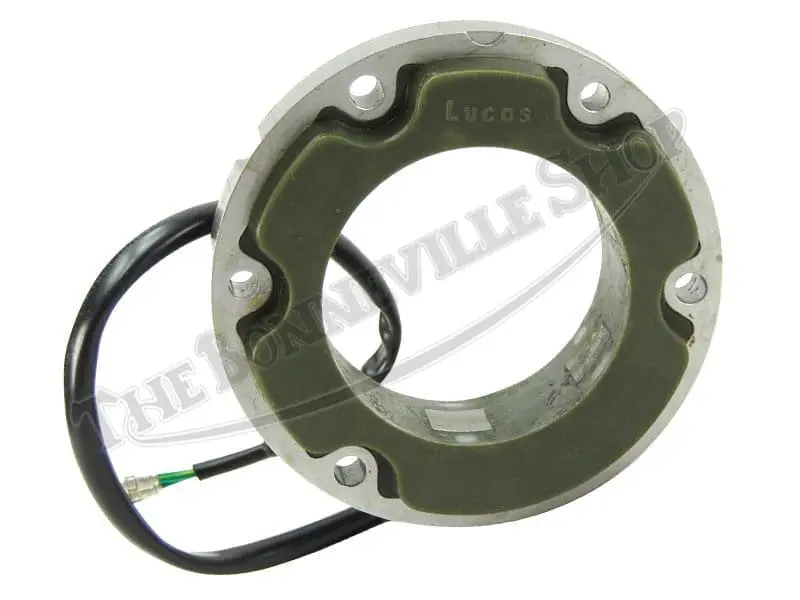 New production Lucas 10amp stator for Triumph, Norton, BSA, Royal Enfield and other British motorcycles. 2 wire stator for 12v single phase charging systems.