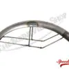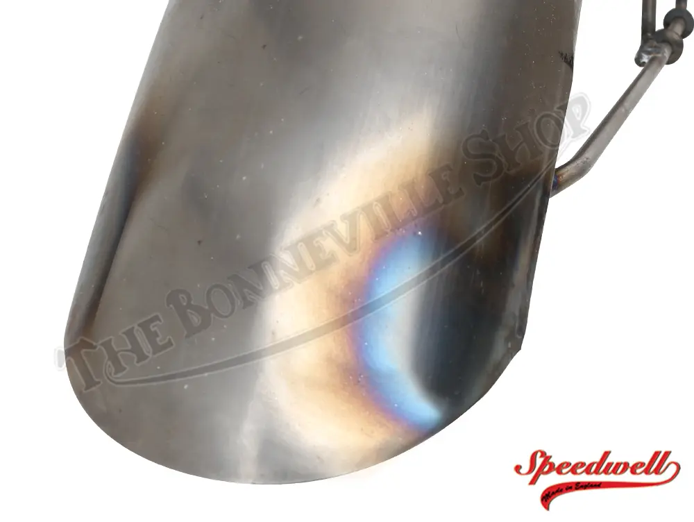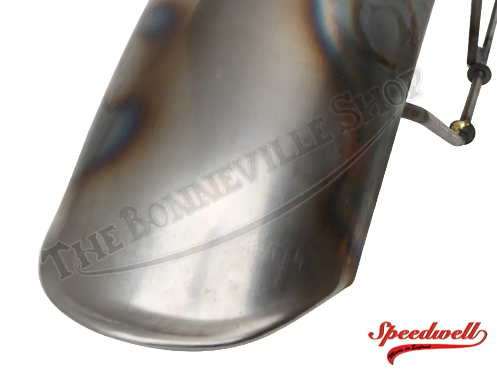 This is the updated short unfinished mild steel front mudguard with the fixed wire stays, including the center vertical braces, as specified for the US-market 1972 Triumph TR6R and T120R models, which featured painted mudguards. Tip to tip measurement is approximately 22″. Genuine Speedwell manufactured in the UK.