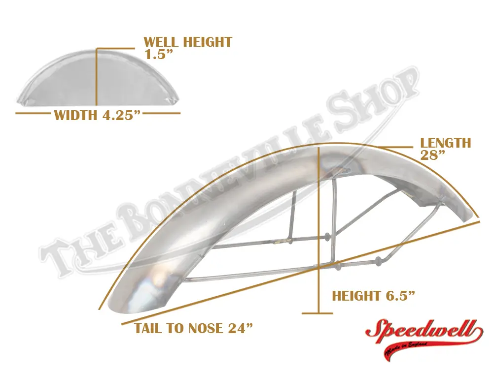 This fender is handmade and supplied without a finish. Some prep work will be required prior to painting and installing. The front mudguard provides protection for the rider and the motorcycle from the elements and serves as a fork brace, stabilizing the front fork during cornering and hard braking.