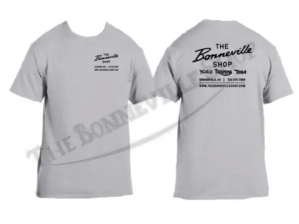 Look your best in our ‘The Bonneville Shop’ t-shirt. Front breast print with full size print on back, black ink printed on ash grey ultra-comfortable pre-shrunk 99% cotton / 1% polyester blend Gildan t-shirt.