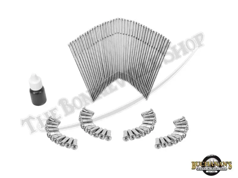 Simply as good as it gets. Check out our us made stainless steel spoke set by Buchanan’s for Triumph WM3 x 19″ front rims mounted to the full width 8″ drum. If it’s time to re-lace those old wheels this is the way to go. These spoke sets can also be polished for a chrome like finish that will last for years. The nipples measure .300 diameter and the spokes are the correct 8-10 gauge. Also supplied with Buchanan’s correct proprietary assembly lube to prevent thread galling.