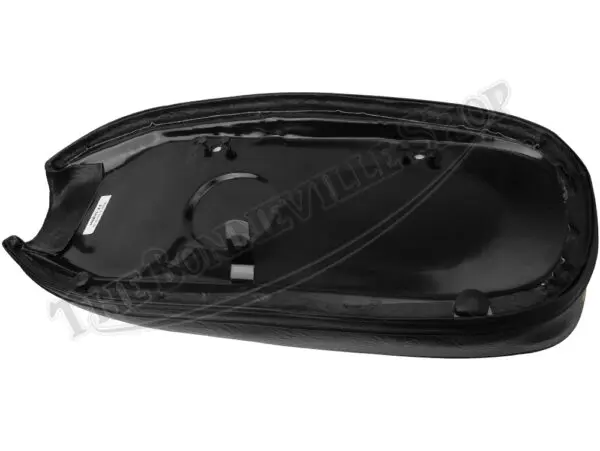 Manufactured in the UK to original specifications, this top quality black-top dual seat features black piping and a black band around the bottom of the cover. This is a restoration quality seat and is finished with the gold Triumph logo on the back of the cover.