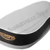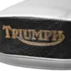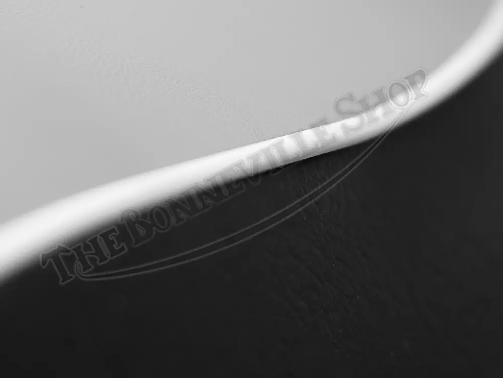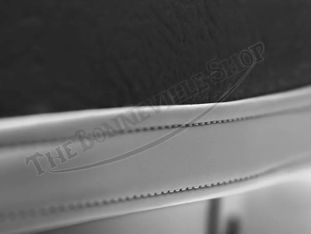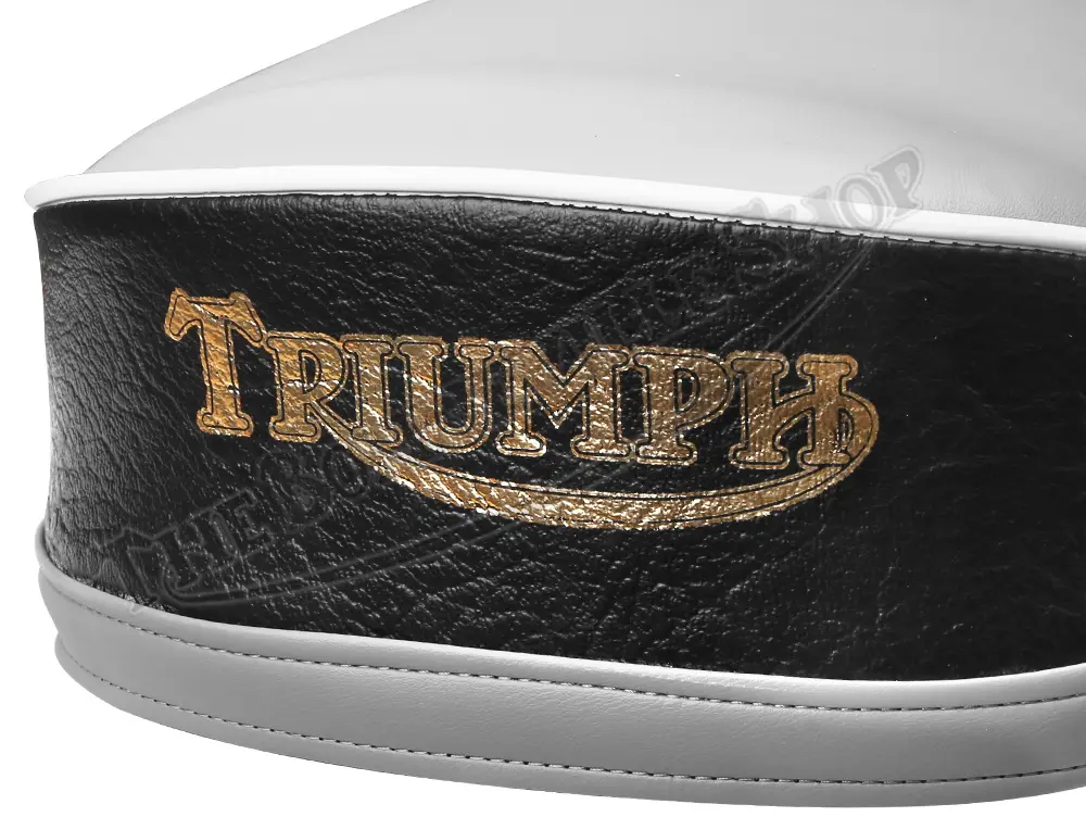 Manufactured in the UK to original specifications, this top quality grey-top dual seat features white piping and a grey band around the bottom of the cover. This is a restoration quality seat and is finished with the gold Triumph logo on the back of the cover.