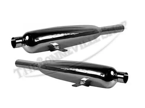 This matching left-hand and right-hand set of chrome silencers are suitable for fitment to the unit-construction Triumph 350 and 500 models with down swept exhaust pipes. They feature an offset inlet tube and integrated mounting stay.