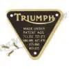 New brass Triumph patent plate / timing cover badge and stainless steel hammer drive rivets, replaces PN# 70-4016 E4016 plate and 60-4255 D4255 rivets. These look great on custom and stock bikes alike.