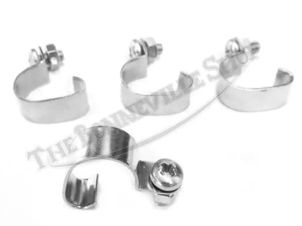 Triumph breather clip set (4) as used on late 1969 500, 650 models and 1973-78 750 models. Will fit T100R, T100C, TR5T, TR6, T120, TR7, T140, Tiger, Trophy, Bonneville, Trophy Trail, Thunderbird, etc. We even supply these with the necessary mounting screws and nuts to save you a trip to the hardware store.