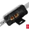 Power to the switch is fed from two wires in the wiring harness. The slider is activated when the brake pedal is depressed and the linkage pulls on the spring, switching on the rear brake light bulb.