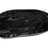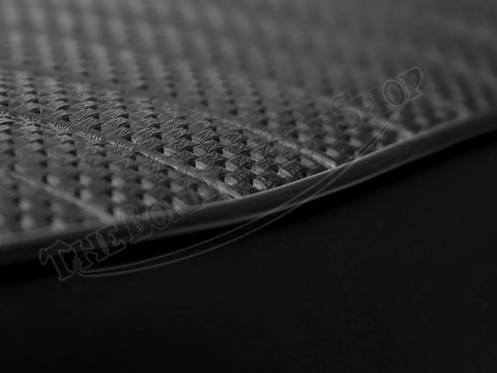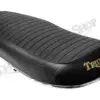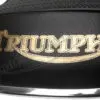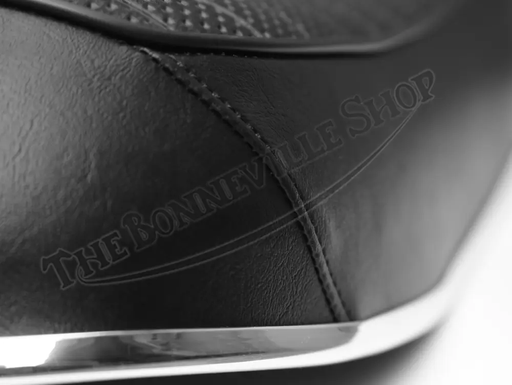 Manufactured in the UK to original specifications, this black-top dual seat features a basketweave top pattern with a silver trim strip around the skirt of the seat cover. The hinge spacing is 11″ and a gold Triumph logo is featured on the back of the cover.