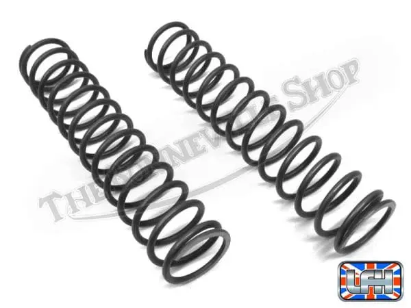 Top of the line standard (yellow / blue coded) Triumph front fork spring set (2). Will fit 1964 to 1970 650 Triumph twins, up to 1974 Triumph 500 twins and 1969 and 1970 BSA 500 and 650 twins.