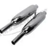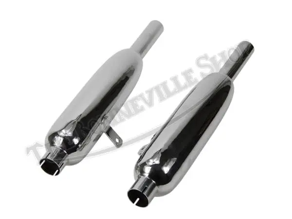 Beautiful UK made exhaust silencers / mufflers from TJ Wassell for 1960-62 duplex frame Triumph 650 twins including Bonneville, Thunderbird, 6T, T120, TR6, Trophy. Mounting tabs integrated as originals, these are hand made in small batches and may contain minor imperfections but are as close to originals as you’ll find! 1-5/8″ ID inlet, sold in pairs. Also look great on customs, very limited availability!