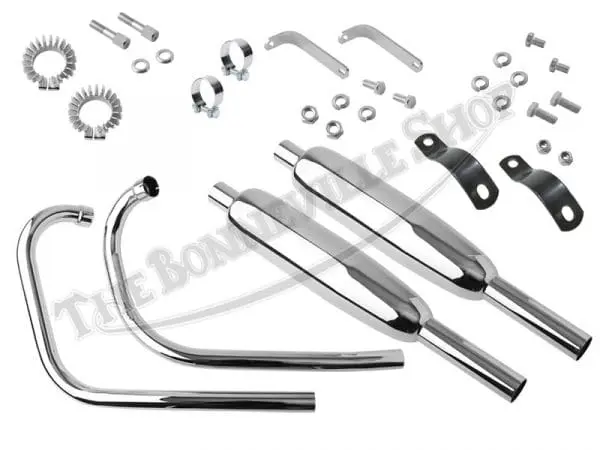 If you are looking for a one stop solution for replacing the exhaust on your Triumph 650, it doesn’t get any easier than this! We’ve assembled this kit suitable for all Triumph unit 650 Twins up to 1970 and include not only the pipes and mufflers but all hardware necessary to install on your bike. Kit includes: