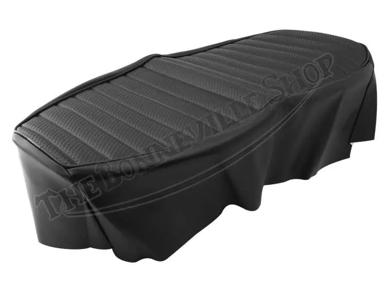 Top quality seat cover with a gold Triumph logo on the back. Will fit Bonneville T120 and Tiger TR6 models from 1971-1972 with the slim nose, U.S. type seat and ‘lunchbox’ type seat latch on the left (primary) side of the bike.