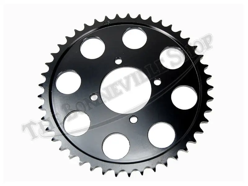 Nice quality 45 tooth rear wheel sprocket to fit Triumph 750 disc brake twins and triples 1975-82. Note: these sprockets are the 4 bolt type for wire wheels, these are not compatible with later cast wheel Triumph twins.