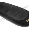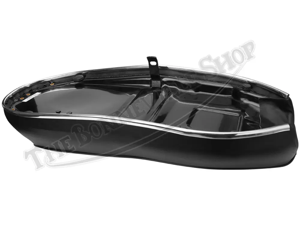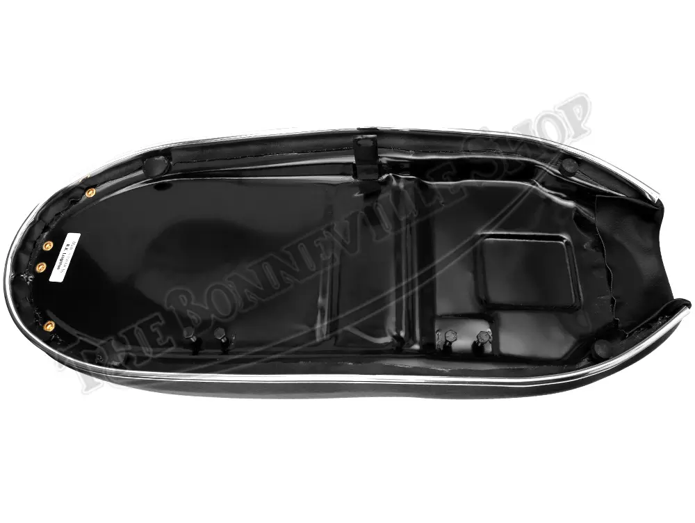 Manufactured in the UK to original specifications, this black-top dual seat features a basketweave top pattern with a silver trim strip around the bottom of the cover. This is a restoration quality seat and is finished with the gold Triumph logo on the back of the cover.