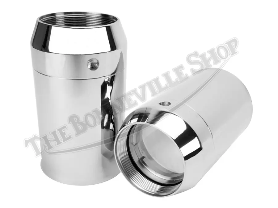 This chrome plated dust excluder sleeve nut, or fork seal holder, is correct for the 1964-1968 Triumph twins, however, there is no recess cut in the threaded portion to accommodate the sealing o-ring, as fitted to the 1967-1968 models. The part number was never changed from the 1964-1966 condition. This listing is for (2) seal holders.