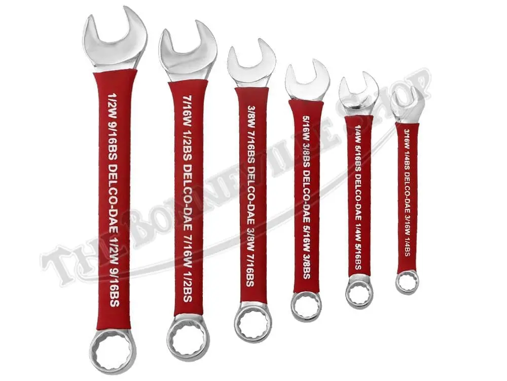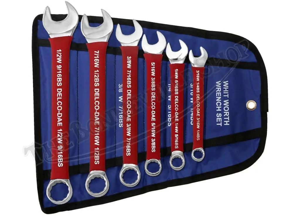 Included in this set of 6 spanners are the following: 3/16W 1/4BS, 1/4W 5/16BS, 5/16W 3/8BS, 3/8W 7/16BS, 7/16W 1/2BS, and 1/2W 9/16BS. Whitworth tool sizes refer to the shank diameter of the bolt, and will fit on Whitworth, BSF, BSC, and CEI nuts and bolts. Sourced from Delco-Dae in the orient.