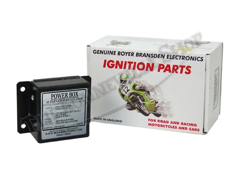 We’ve had countless inquiries regarding running Triumph, Norton and BSA motorcycles battery-less with an electronic ignition…here’s the solution! This Boyer powerbox eliminates your stock rectifier and Zener diode, providing bulletproof solid state reliability in a compact, easy to install package (with installation instructions). Lighting delay allows you to still run lights on your bike without having a dedicated lighting switch, perfect for minimalist custom applications. Compatible with 12v single phase charging systems, can be used with or without a battery.*