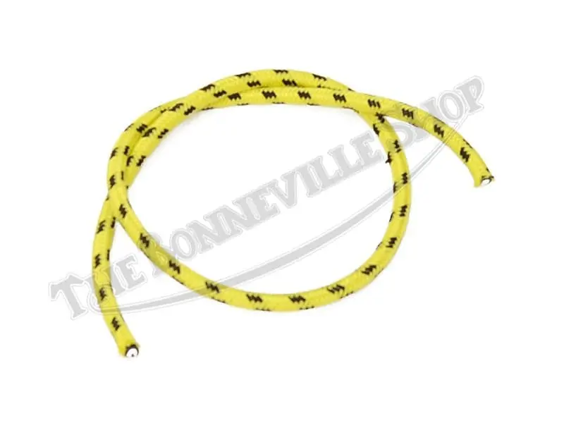 Top quality cloth wrapped 7mm copper core high tension spark plug wire lead finished in black fleck on yellow pattern. Sold in 2′ length, enough to make up 2 spark plug leads for Triumph 650 twins up to 1970 and 500 twins up to 1974 (with coils in stock location under petrol tank) or can be used to make up 1 spark plug lead for Triumph oil in frame twins 1971 onward with coils under seat.