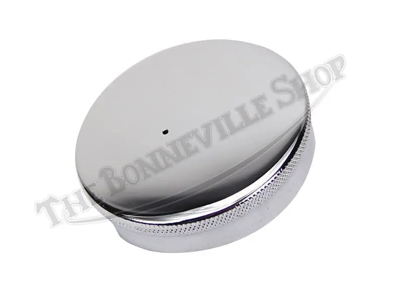 CEANDESS Brand, Chrome Flat Top Fuel Cap with Offset Vent Hole as originally fitted to Triumph and BSA Motorcycles. Top Quality UK Chrome with a correctly located Vent Hole, supplied with a Cork Gasket as the original. These Caps will fit Triumph Motorcycles back from the Pre-Unit days through 1971.