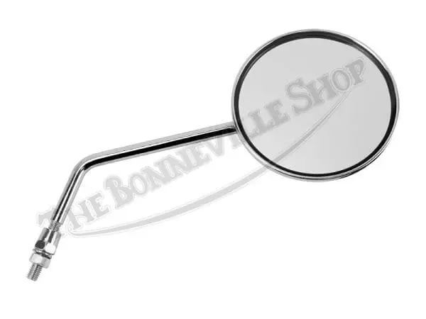 After years of looking for a suitable mirror to suit most all Triumph, Norton & BSA motorcycles, we stumbled across these high quality chrome universal round mirrors with 8mm threaded stem. This mirror can be fitted to both right and left hand applications, stem length is approximately 8″ long with about 1-3/8″ of mounting threads. For most later British motorcycles with threaded holes at lever perches, the threads (while not 100% the same) are close enough to install easily (though in some instances a bit of Teflon tape is necessary). For lever perches with a non-threaded through hole, the threads on these mirrors are long enough to pass through to be secured with the enclosed nut. It’s a win, win! Sold individually and in pairs.