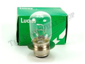 New 410 headlight bulb as used on1979 onward Triumph twins as well as some late model Norton motorcycles. 45/40 watt dual filament (High Beam / Low Beam) bulb on 3 prong P45 base. Sold individually.