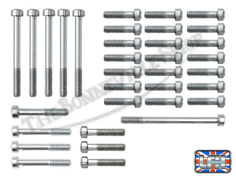 Correct Fillister head engine case screws are manufactured to original specifications by LF Harris in the UK. The 34-piece set is suitable for the chaincase, gearbox, and timing covers on 1954-1962 Triumph Pre-Unit twin cylinder models.