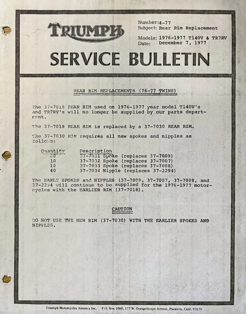 Triumph T140 Rear Rim Retrofit and Service Bulletin 4-77