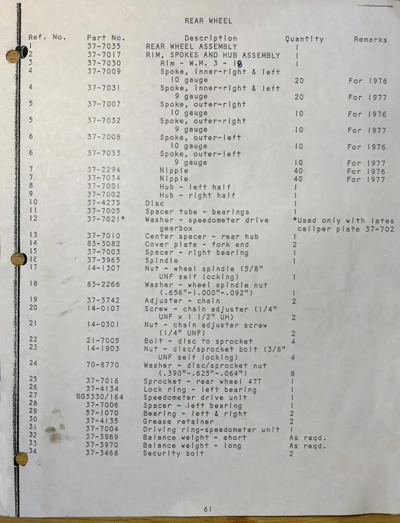The original WM3-18 rear rim carried the part number of 37-7018 and was pierced for .250” OD spoke nipples. The original 1976 factory Replacement Parts Catalog (99-2257) showed the 37-7018 rear rim, along with the thinner 37-7009, 37-7008, and 37-7007 10 gauge spokes. The revised parts catalog is also associated with part number 99-2257, but states “Revised August 1977”, which included the specifications for the 1977 models.